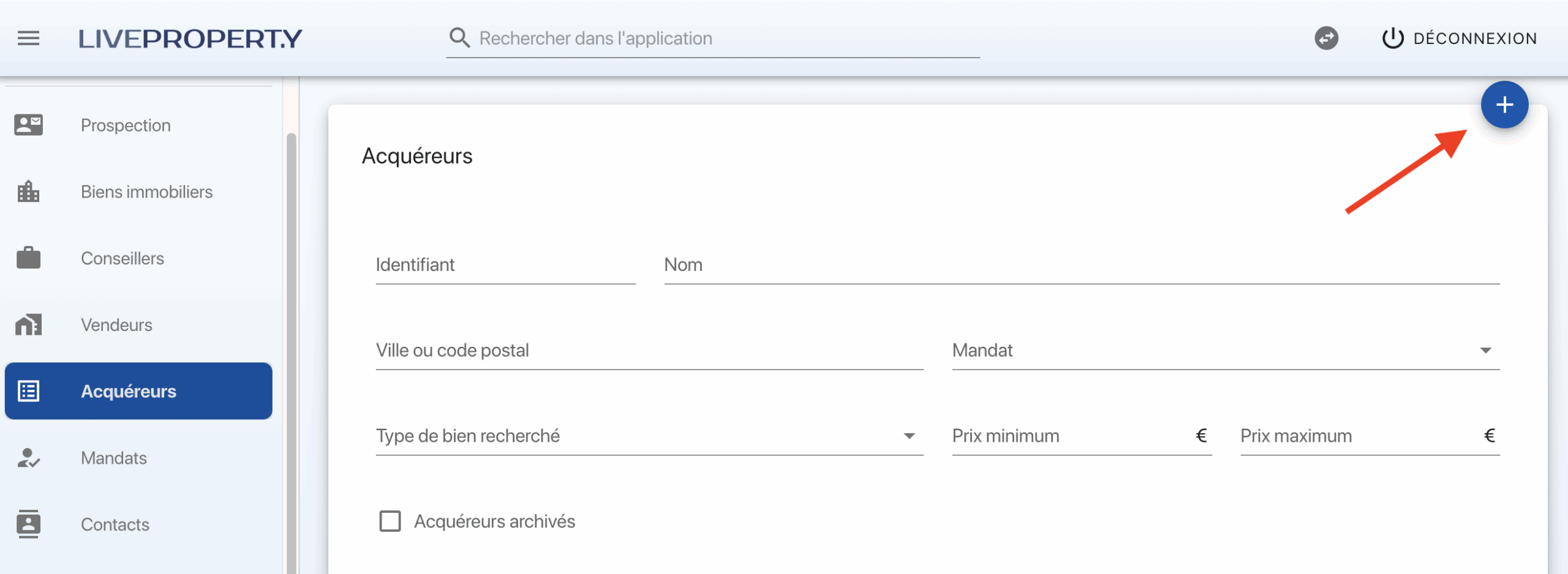 Pour créer un acquéreur > Menu acquéreurs > + en haut à droite